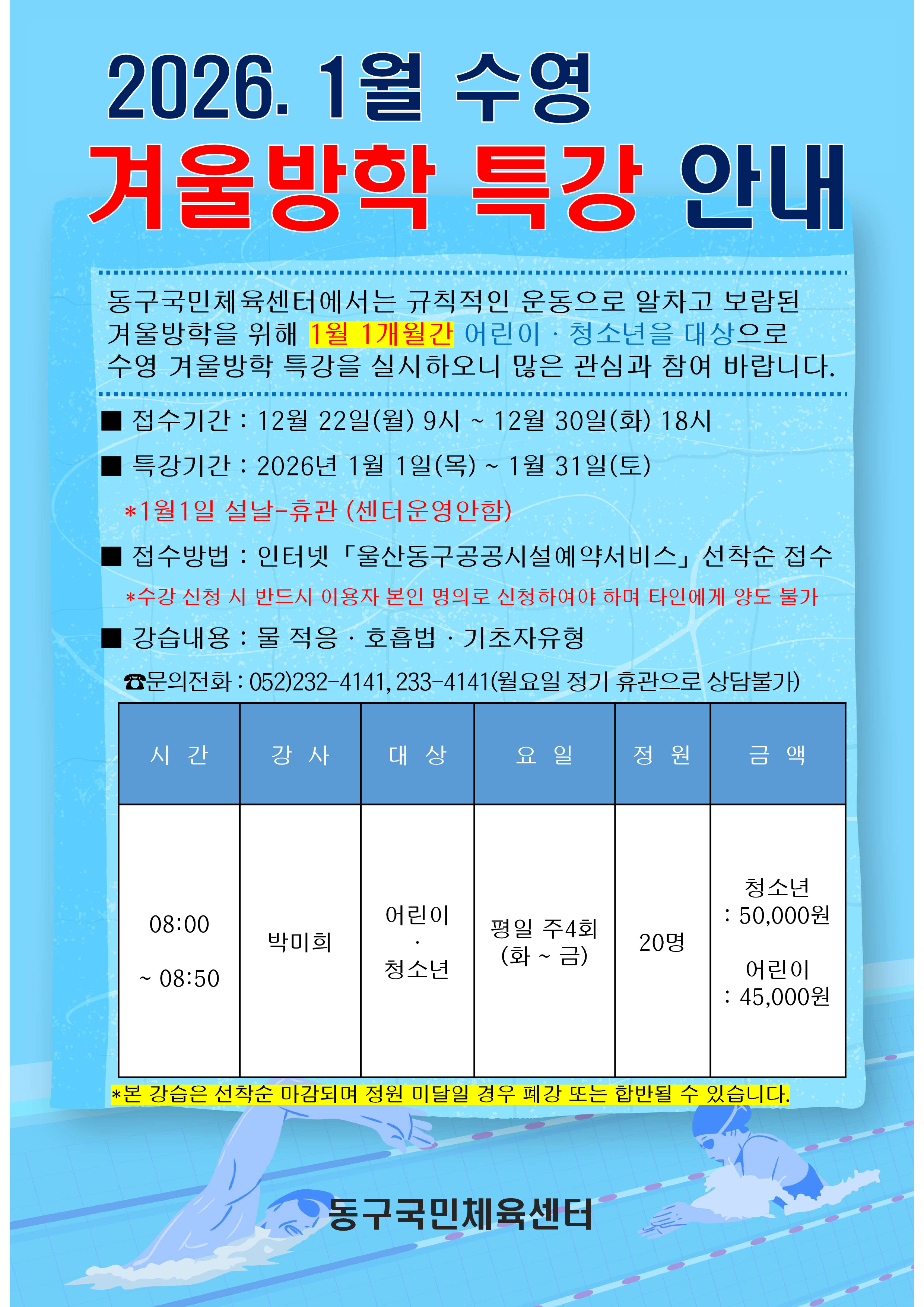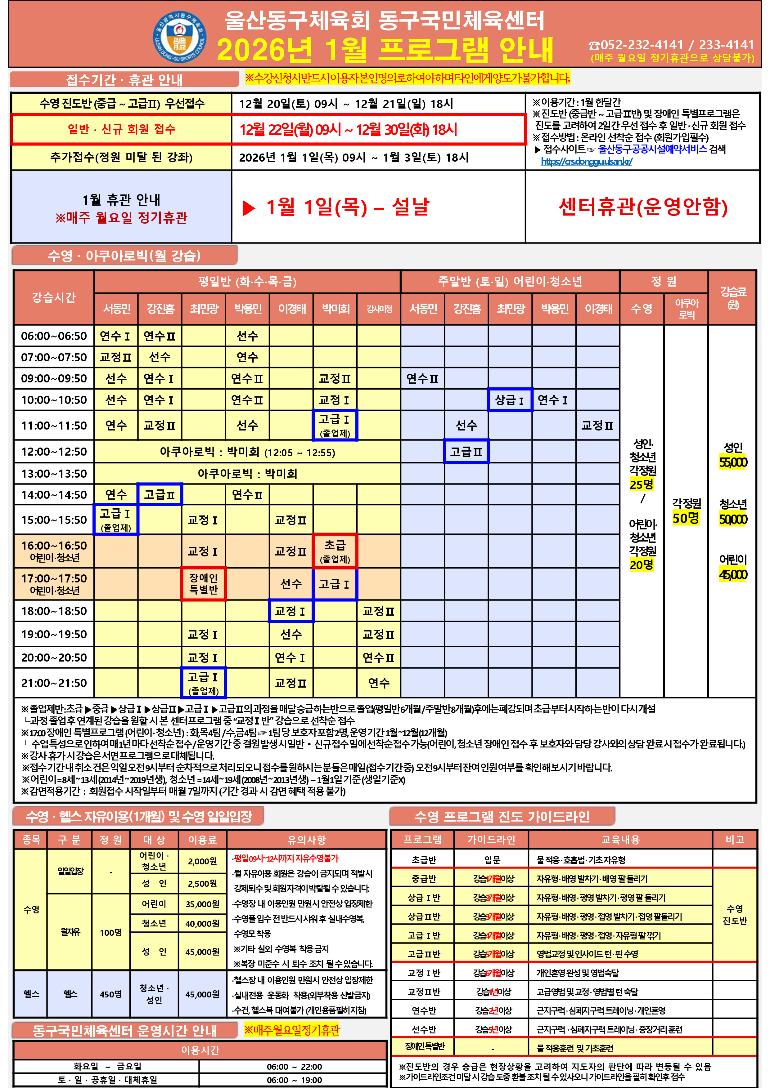 울산동구체육회 동구국민체육센터 2026년 1월 프로그램안내