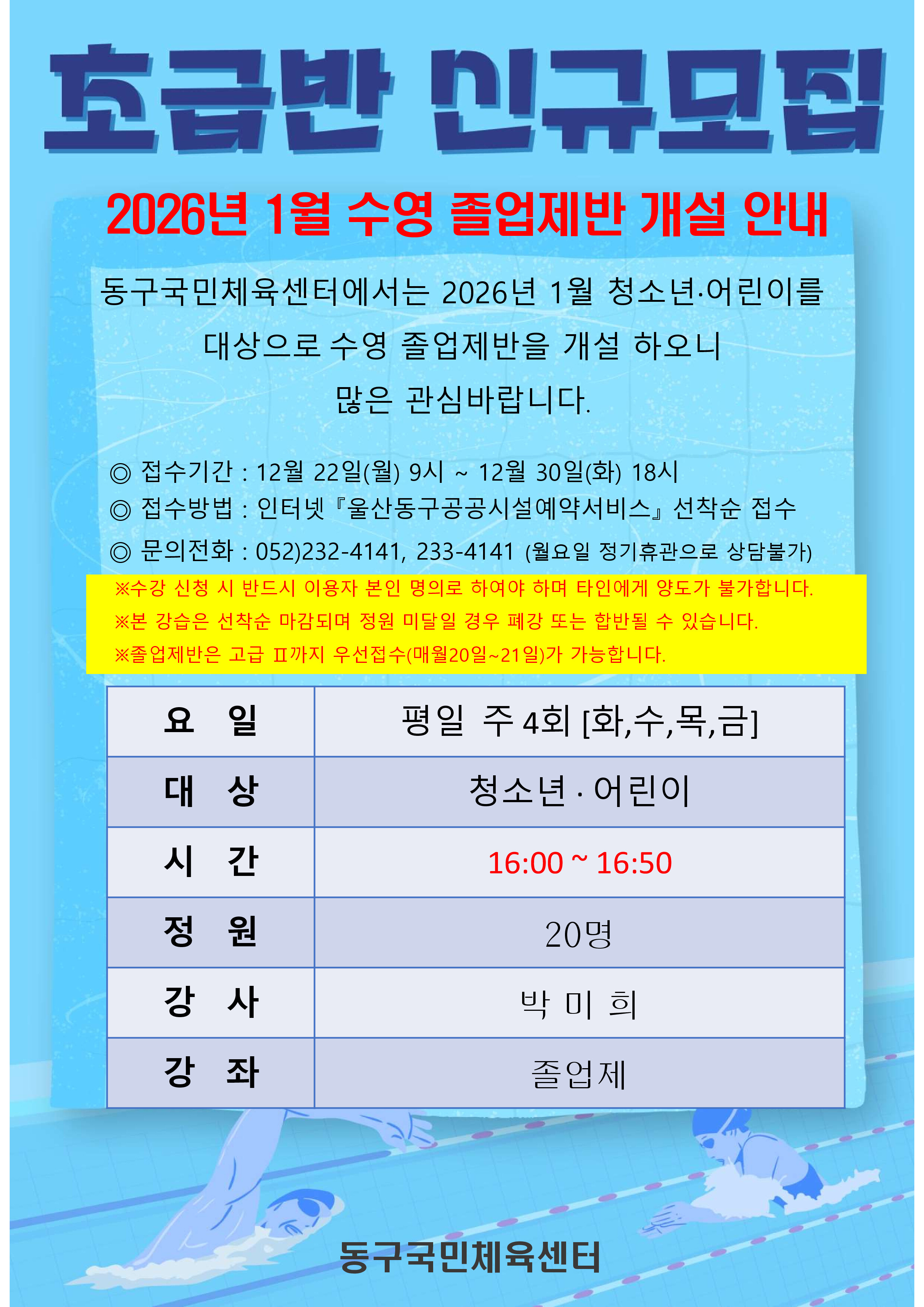 -수영 진도반(중급~고급Ⅱ반·장애인 특별반) 기존 접수 : 12. 20.(토) 09시~ 12. 21.(일) 18시