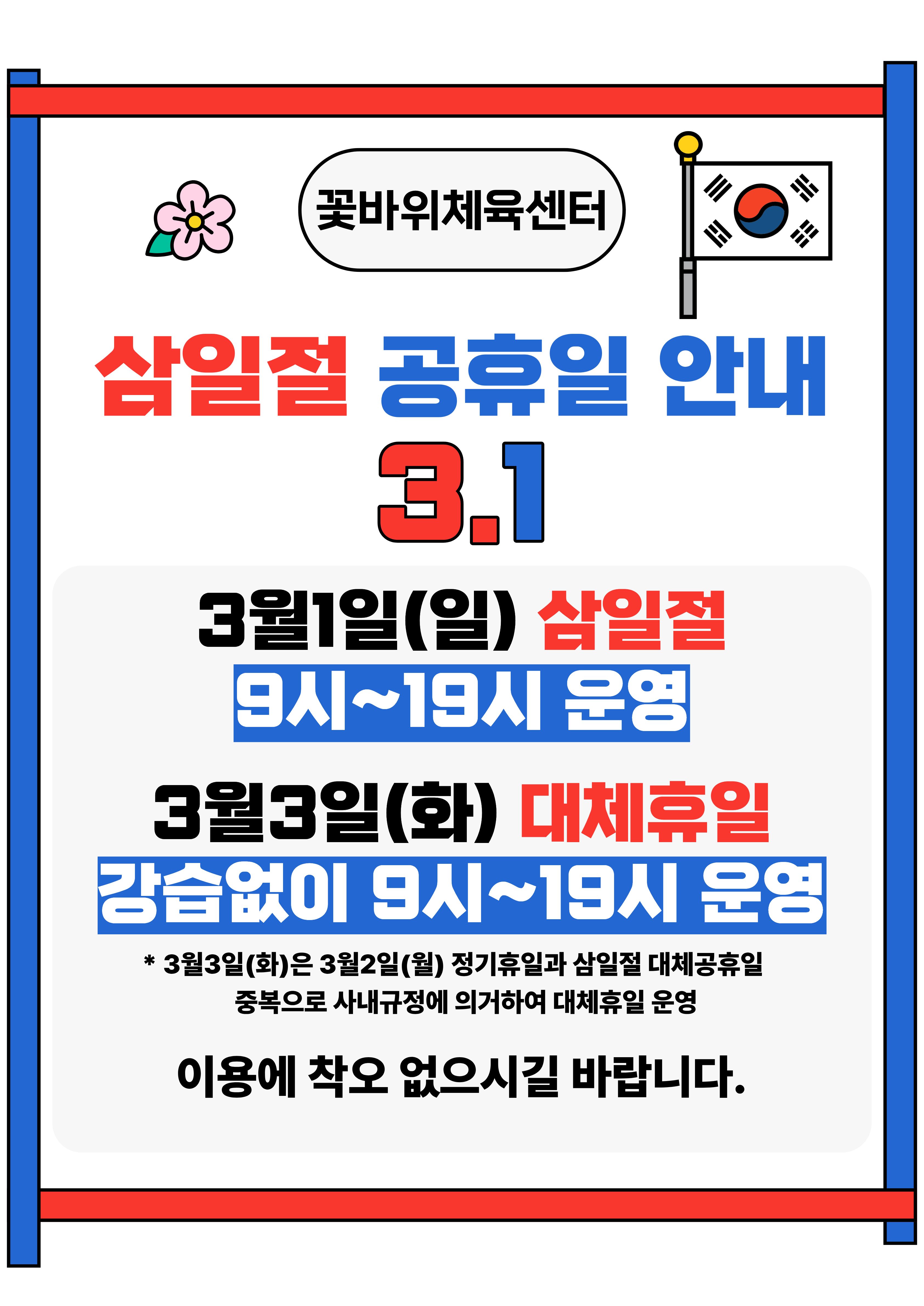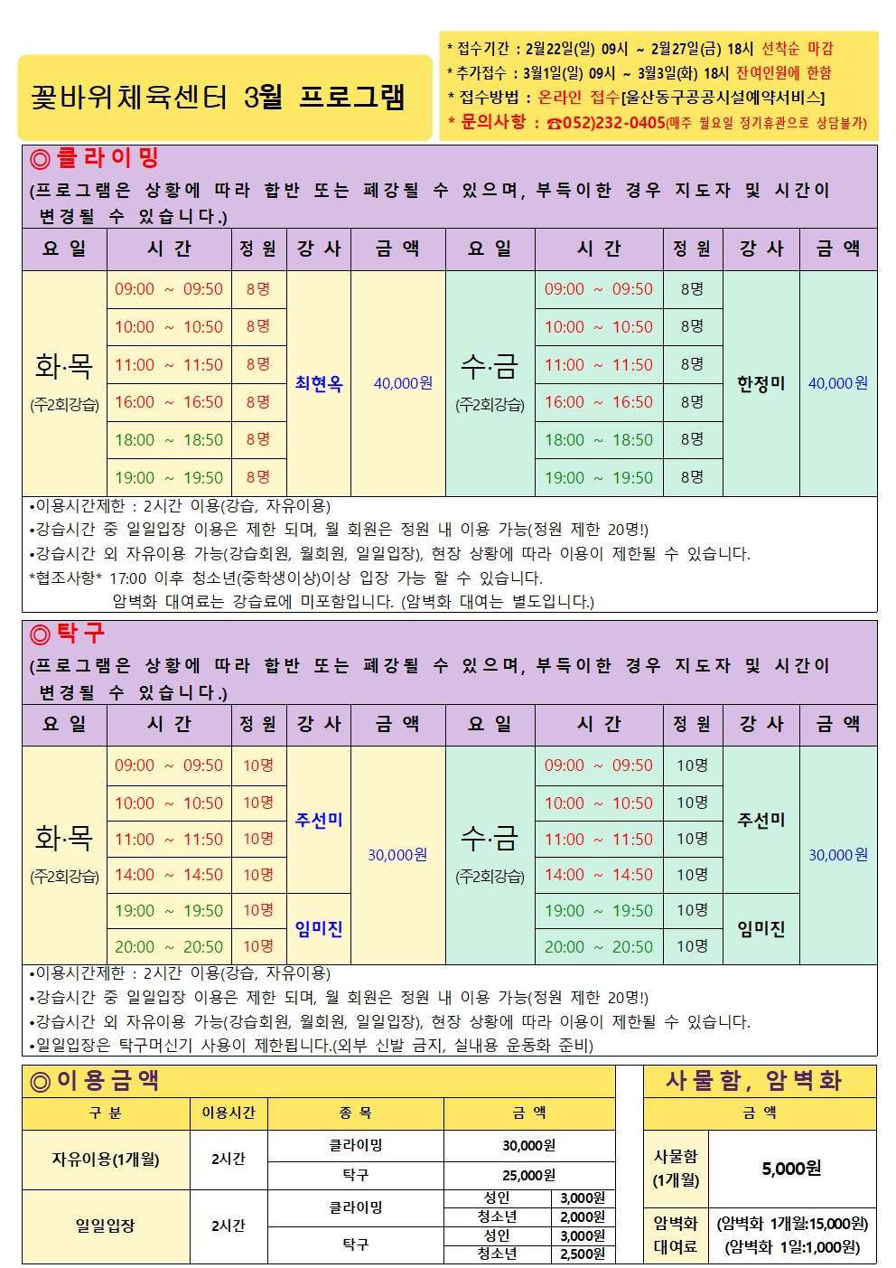 울산동구체육회 꽃바위체육센터 2026년 3월 프로그램 안내
