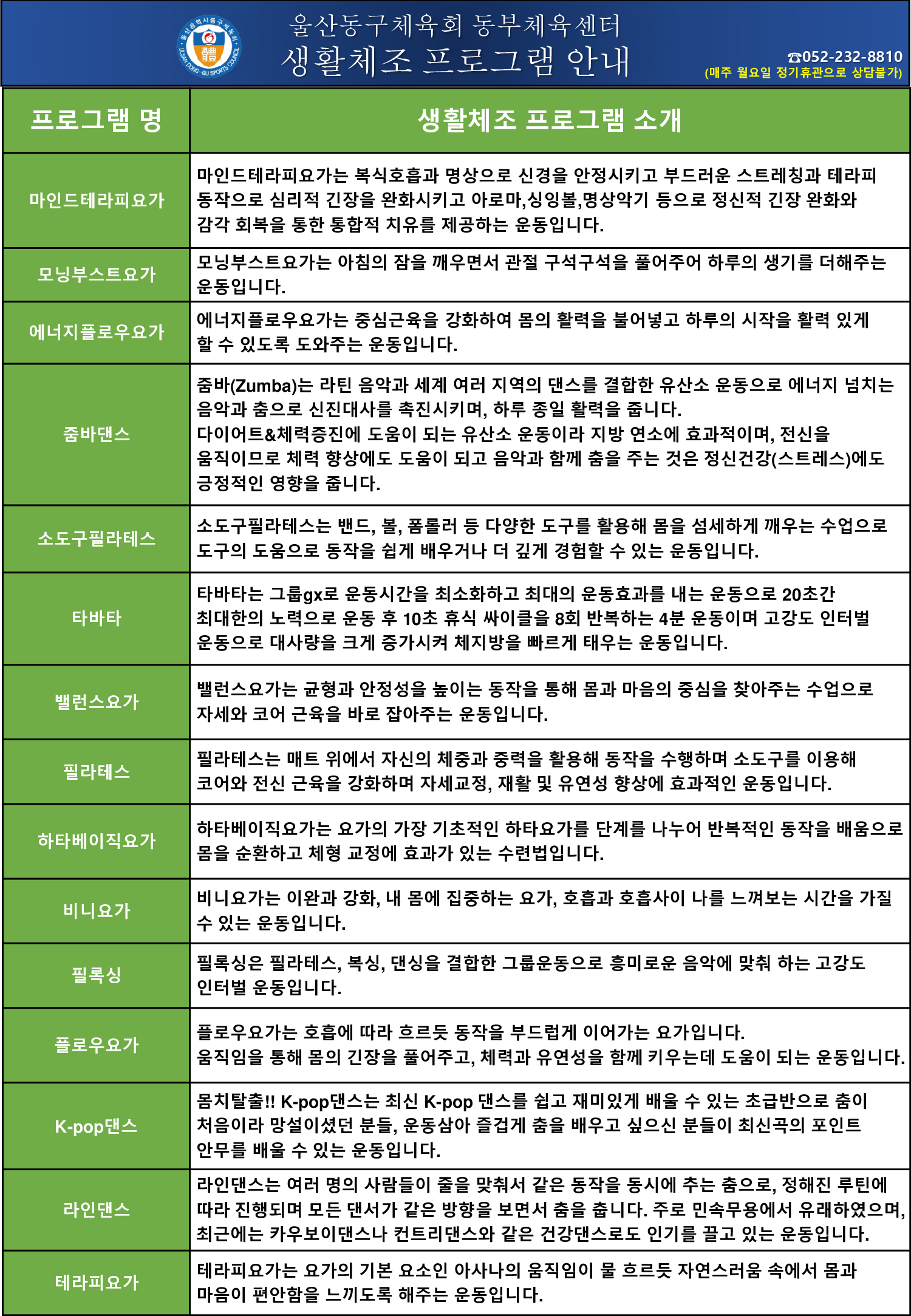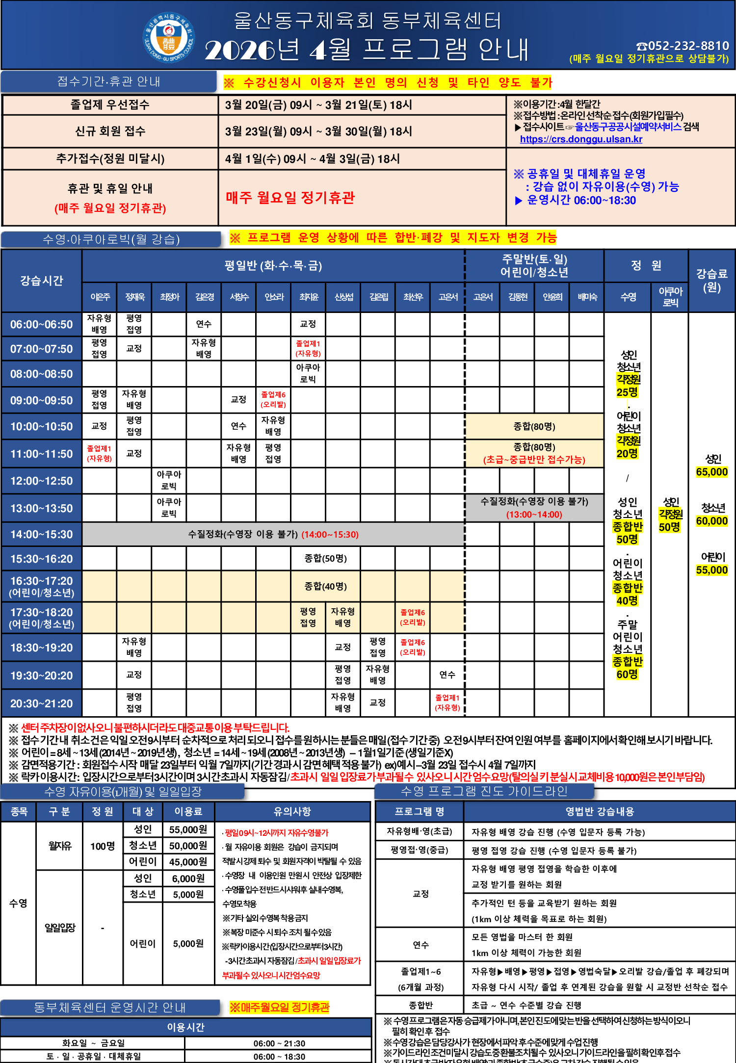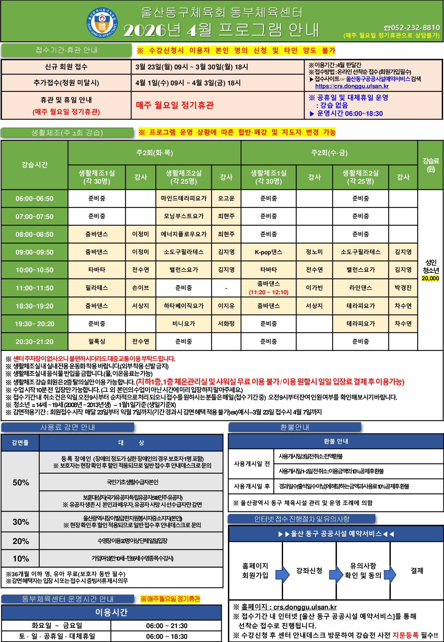 울산동구체육회 동부체육센터 2026년 4월 프로그램안내