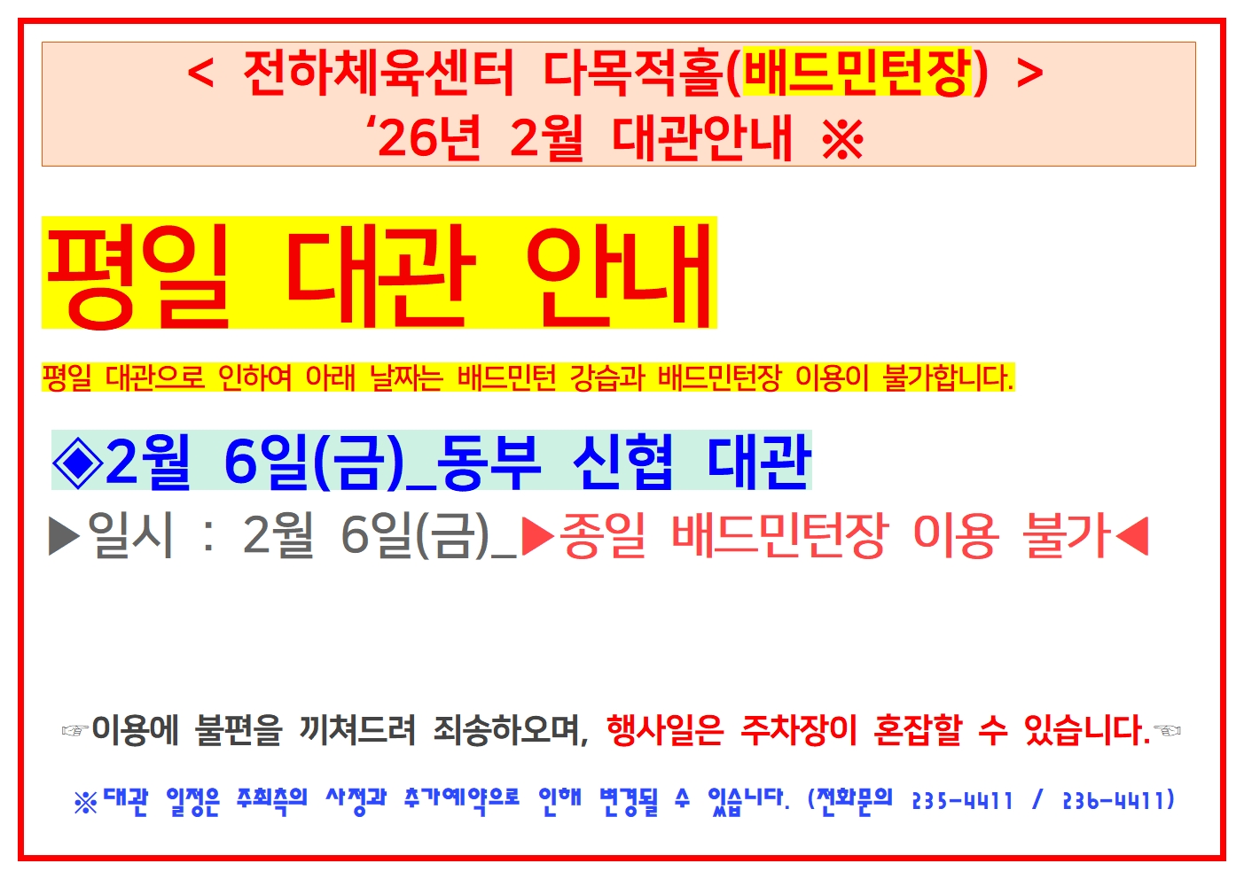 전하체육센터 2026년 2월 대관 일정 안내
