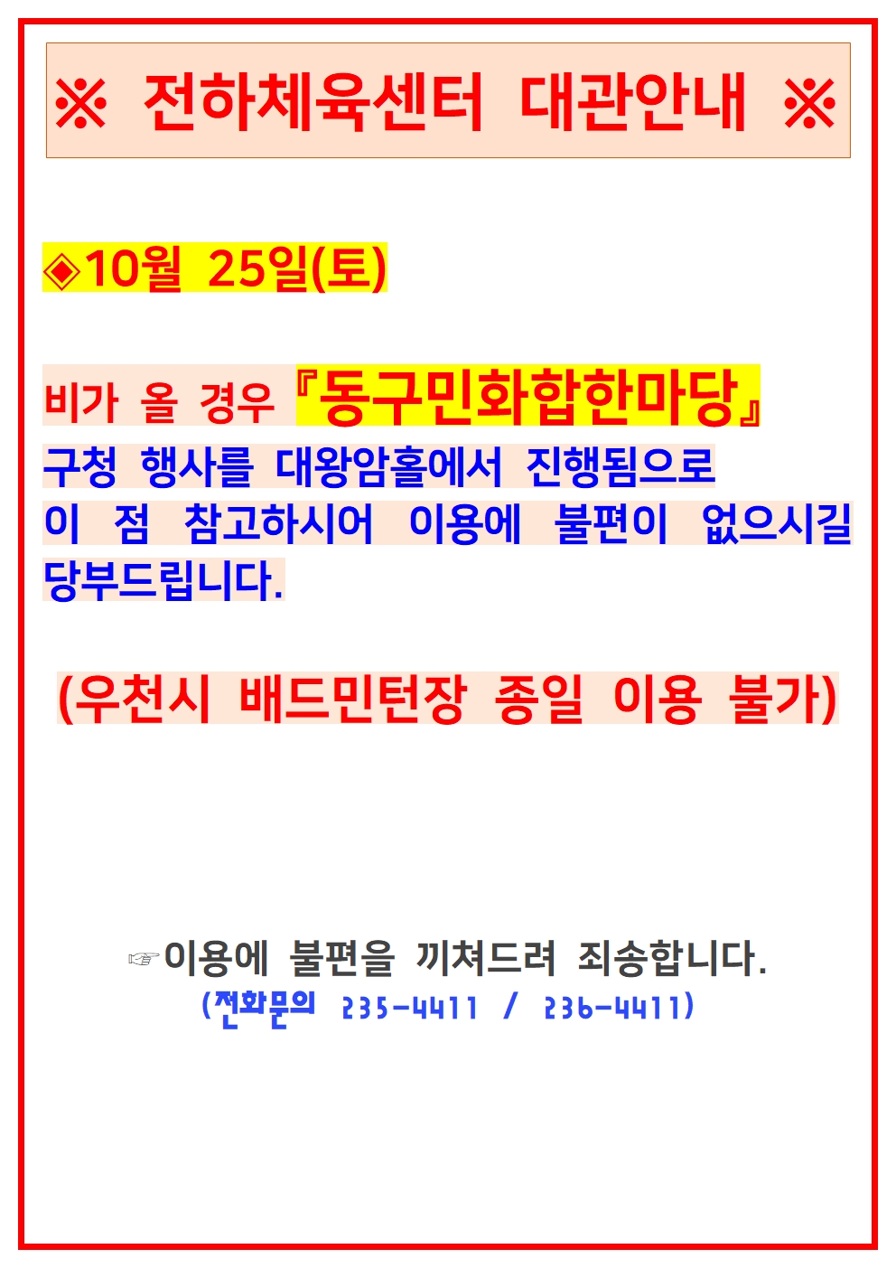 10.25(토) 우천시 배드민턴장 이용불가안내