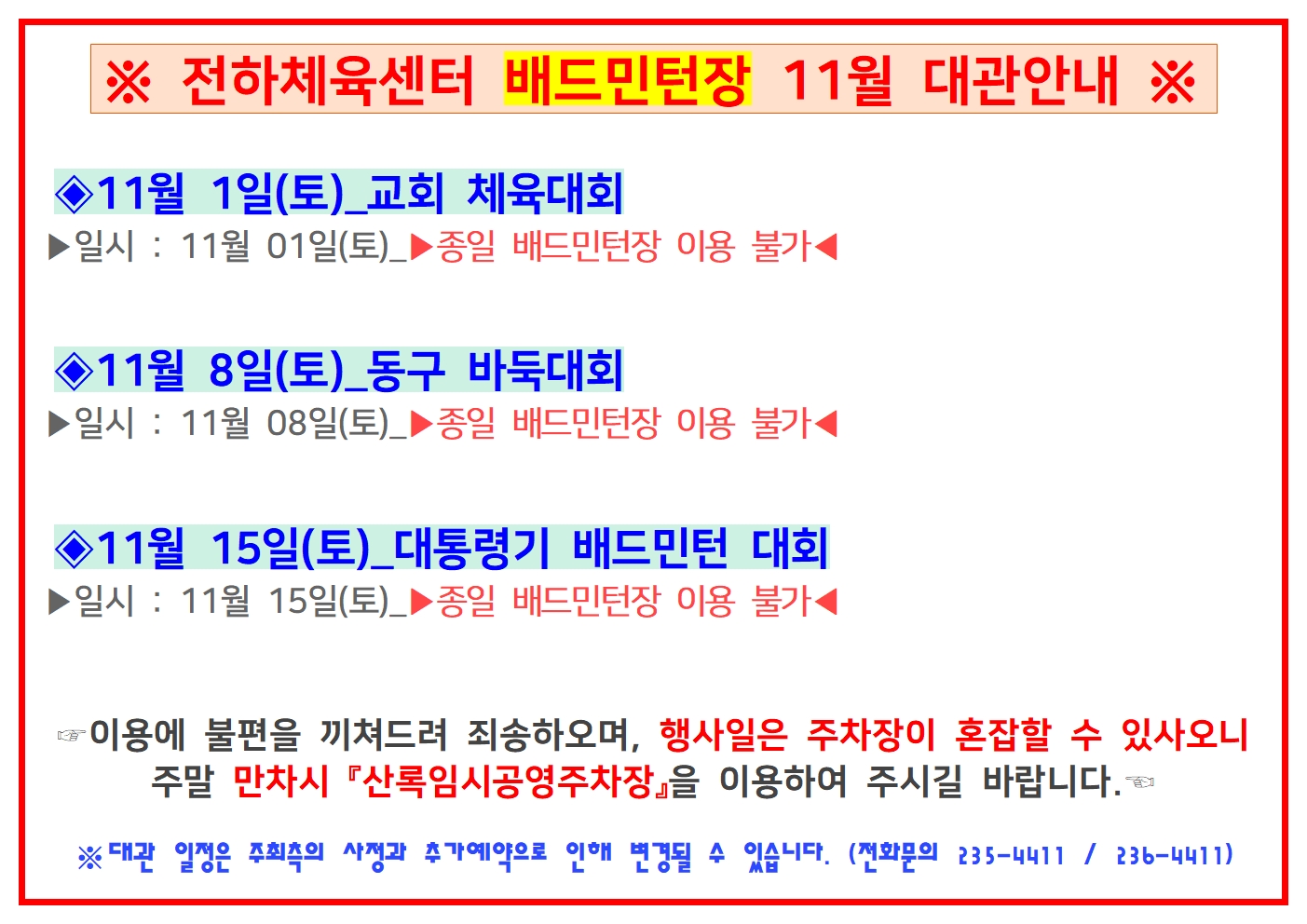 전하체육센터 11월 대관 일정 안내