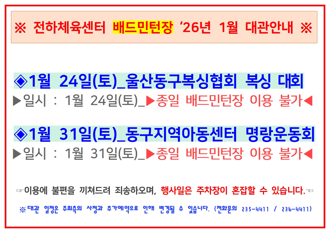 전하체육센터 2026년 1월 대관 일정 안내