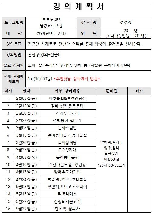 * 재료비는 첫 수업시 회원들의 의견을 취합합니다.