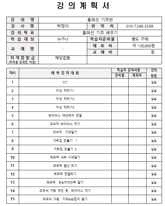 *재료준비가 어려우신 분은 첫 수업시 강사와 의논하시면 됩니다.